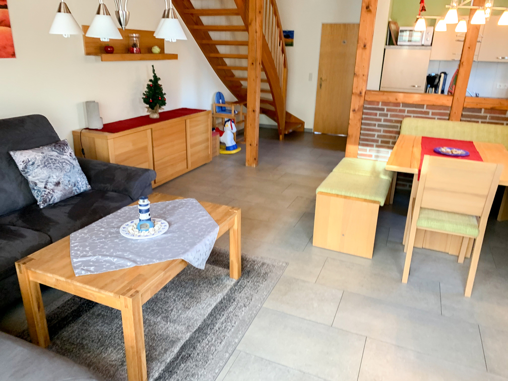 Im Erdgeschoss befindet sich ein großzügiger Wohnraum mit einer abgetrennten Küche, in der Spülmaschine, Herd mit Cerankochfeld, Backofen, Mikrowelle, Kaffeemaschine, Senseomaschine, etc. vorhanden sind. Im Wohnbereich finden Sie neben einer Ledergarnitur, eine Essgruppe sowie eine Wohnzeile. Ein LCD-Flachbildschirm mit DVD-Player sowie eine Stereoanlage sind ebenfalls vorhanden. Ferner ist ein kostenloser Internetzugang mit WLAN verfügbar. Für die kleinen Gäste steht ein Kinderhochstuhl bereit. Weiterhin sind auf dieser Etage ein Bad mit Dusche/WC sowie ein Abstellraum angeordnet.