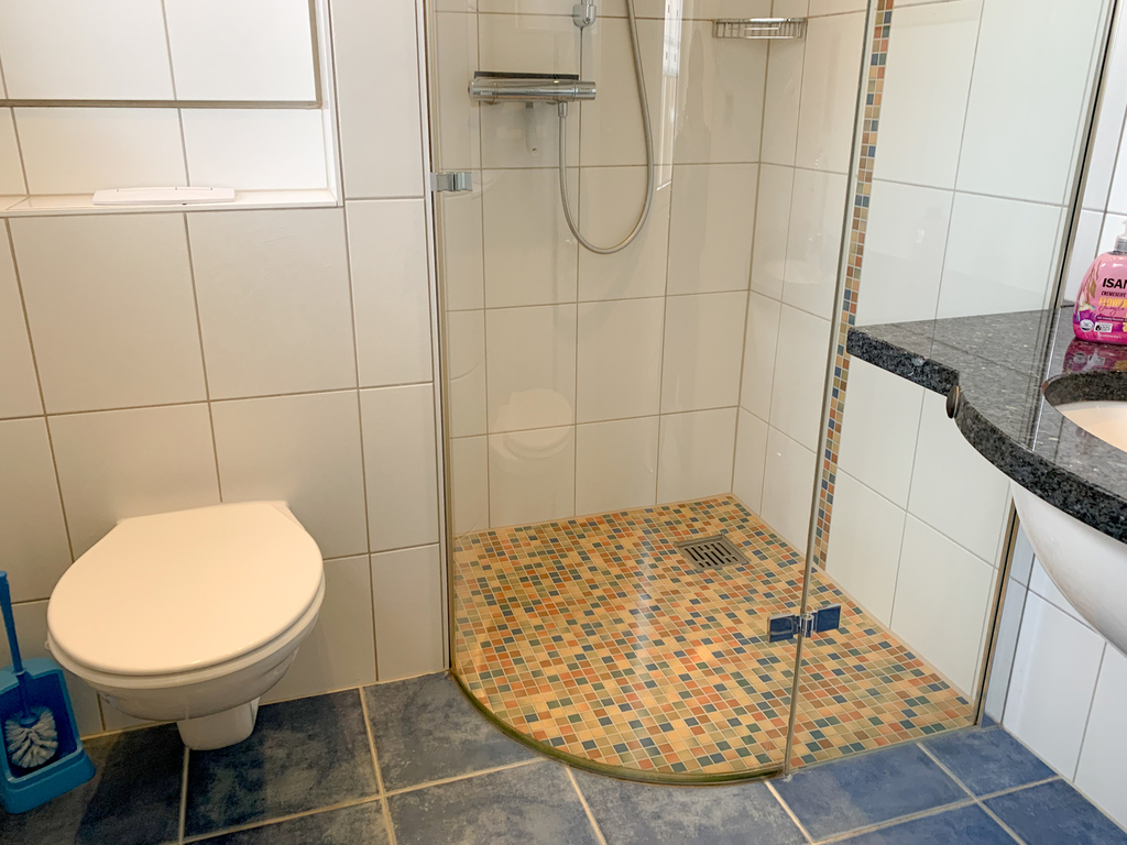 Über eine offene Holztreppe gelangen Sie ins Obergeschoss. Dort befinden sich zwei Schlafzimmer mit Laminatboden, eins mit Doppelbett sowie einem Kinderbett und ein weiteres mit drei Einzelbetten, von denen zwei problemlos zu einem weiteren Doppelbett umfunktioniert werden können. Beide Schlafräume sind mit einem LCD-Flachbildschirm ausgestattet. Des Weiteren ist hier ein zweites Bad mit Dusche/WC sowie Waschmaschine und Trockner untergebracht. Das Bad erhält durch die vorhandene Dachgaube eine besondere Note.